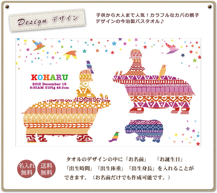 お子様のお名前、お誕生日、出生時間、生まれた時の体重や身長をデザインに入れて、世界にたった一つの、特別なタオルをお作りいたします。