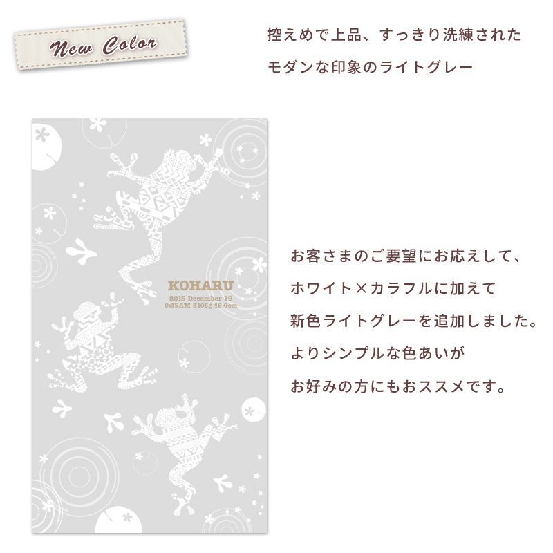 お風呂上がりに赤ちゃんの体を拭いてあげるとき、ベビーベッドに寝かせてそっとくるんであげるとき、産まれた時の感動がふと思い出される記念のギフトとして好評をいただいております。