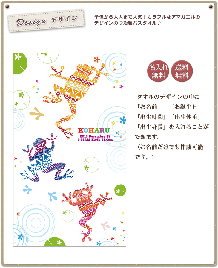 お子様のお名前、お誕生日、出生時間、生まれた時の体重や身長をデザインに入れて、世界にたった一つの、特別なタオルをお作りいたします。